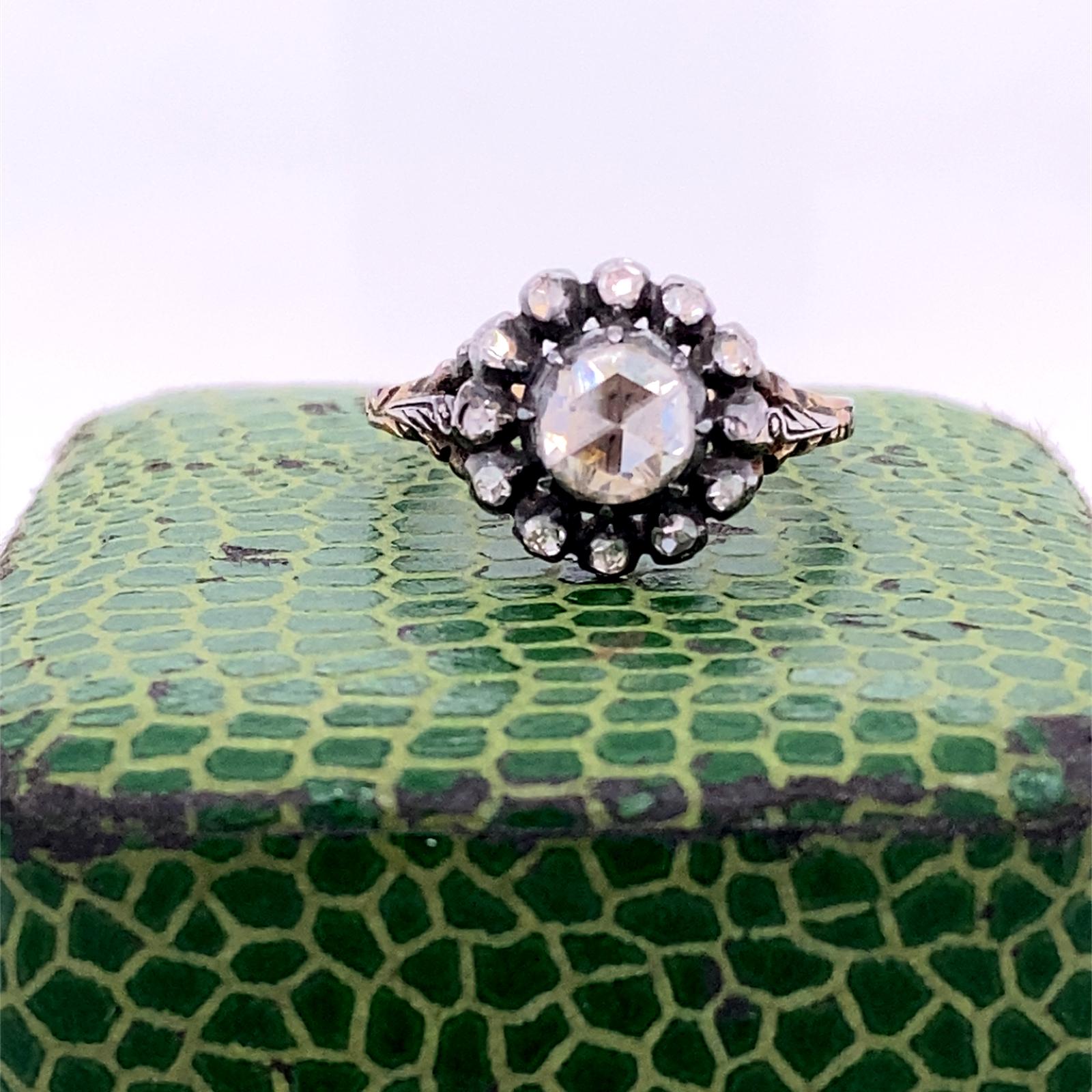 14k geel gouden, zilveren rozet ring met roos geslepen diamant circa 0.70ct